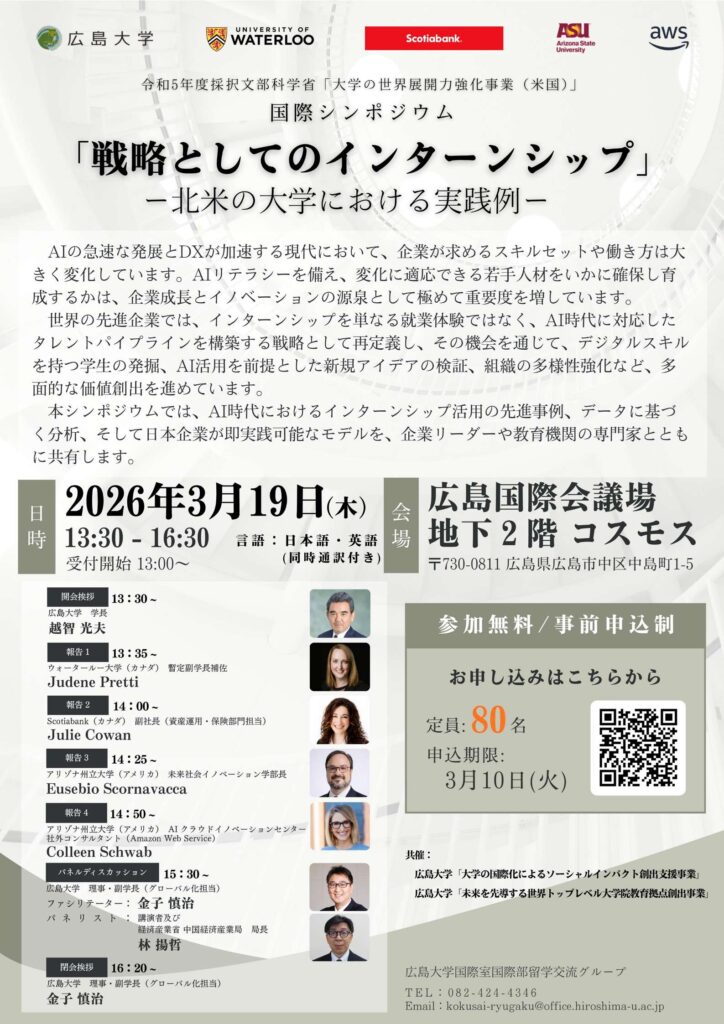 大学の世界展開力事業(米国)では、連携大学であるアリゾナ州立大学及びその連携企業であるAMAZON WEB SERVICE(AWS)、カナダのウォータールー大学及びその連携企業であるScotiabankの方をお招きし、北米の大学や企業のインターンシップの取り組みをご紹介いただきます。(於:広島国際会議場 午後1時30分~)また、講演者4名と経産省 中国経産局の局長を交えたパネルディスカッションも予定しております。興味のある方は、添付のチラシをご確認いただき、3/10までにお申し込みください。